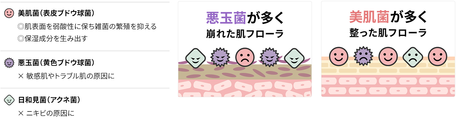 肌の上には、目に見えない約1兆匹の常在菌が存在していて、これを「肌フローラ」といいます。なかでも「美肌菌」と呼ばれる種類は、肌を弱酸性に保つことで敏感肌やトラブル肌の原因となる「悪玉菌」を減らす働きがあります。アクアモイスチャーゲルには、「美肌菌」に働きかける「コメ由来乳酸菌※」を配合。年齢とともに減っていく「美肌菌」をケアする「育菌美容」に取り組めます。