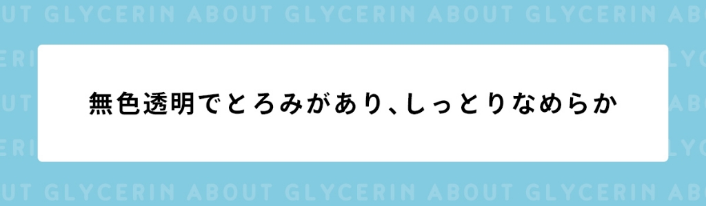 グリセリンは、無色透明で、やや粘性のある液体です。とろみがあるため、グリセリンを配合するとしっとり感、滑らかな使用感となります。水溶性の成分ですが、界面活性剤と一緒に油性の化粧品にも使われています。